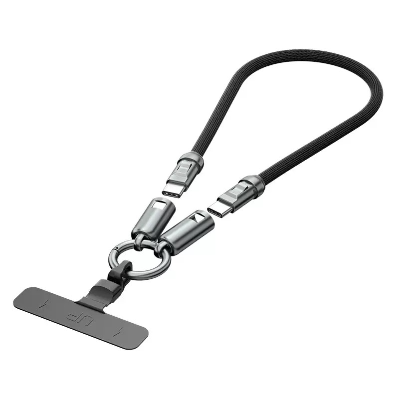 Functions as both a charging cable and a wearable lanyard with an integrated zinc alloy spring clasp for daily carry.